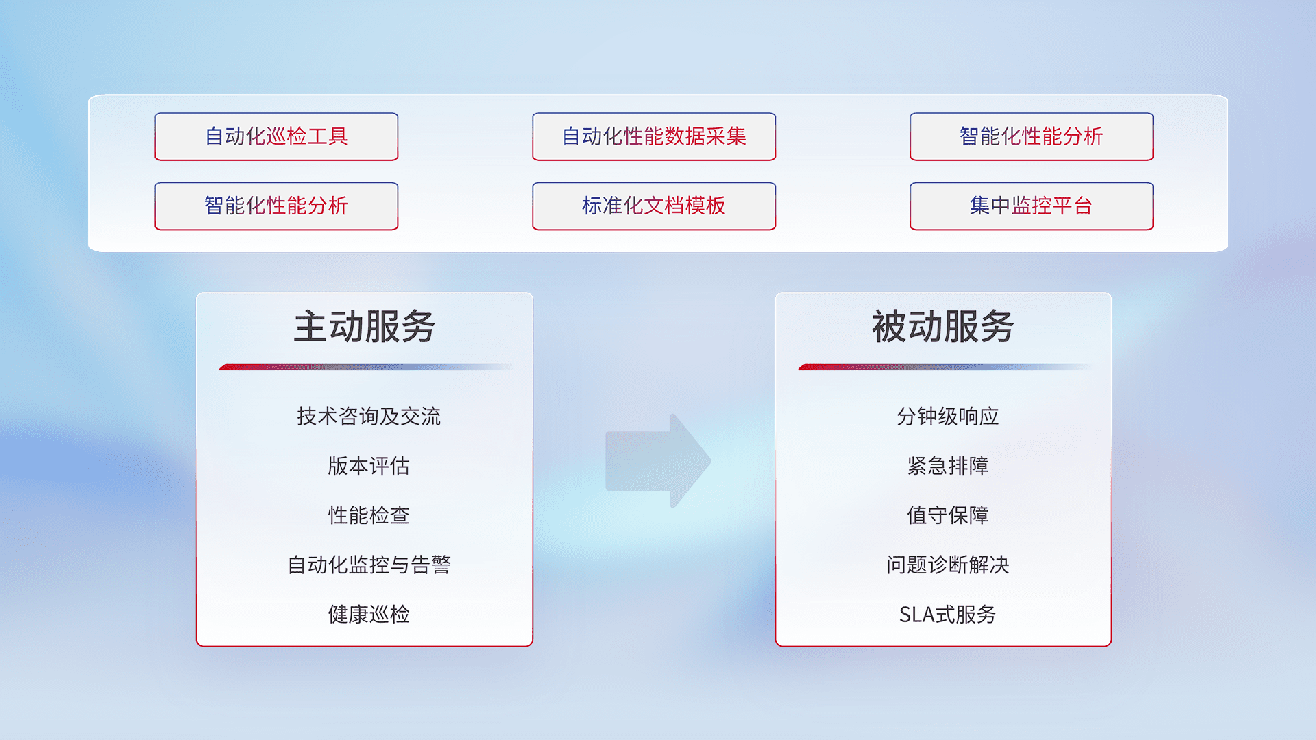 智能化工具和标准化文档,,,,保障服务质量,,,,提供主动服务(包含技术咨询、、、、版本评估、、、性能检查、、自动化监控与告警、、、健康巡检)和被动服务包含(分钟级响应、、、、紧急排障、、、值守保障、、、、问题诊断解决、、SLA服务)。。。。