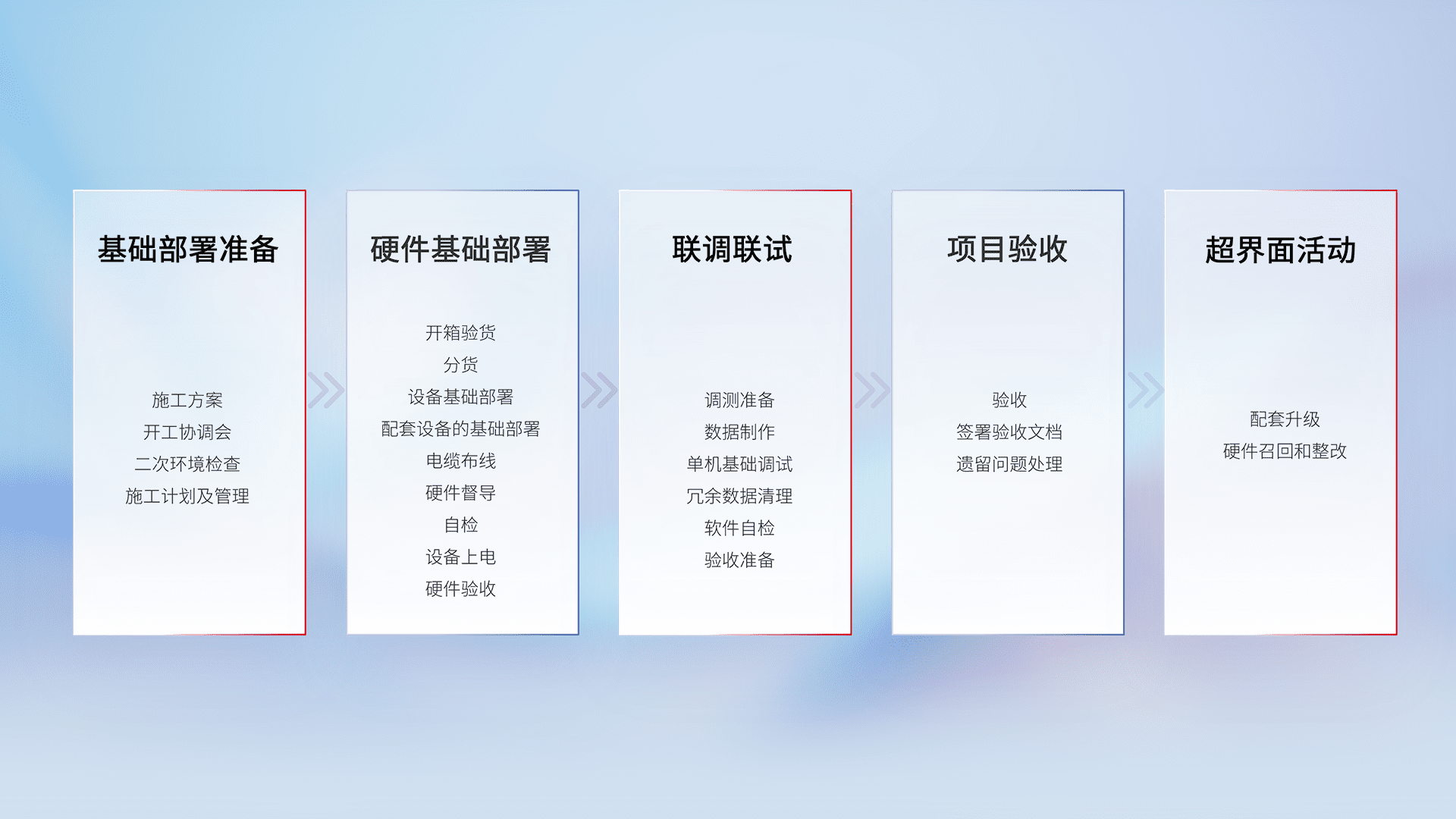 从基础部署准备、、硬件基础部署、、联调联试、、、、项目验收、、越界面活动的全过程可追溯,,,保证施工质量和进度。。。